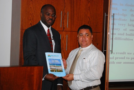 On Monday, October 26, the President of the Princess Juliana International Airport (PJIAE) Eugene Holiday held a press conference in the conference room to give the media an overview on the developments at the airport for 2008, and to hand over PJIAE Annual Report 2008 to the Commissioner of Sports, Tourism, and Aviation Frans Richardson.