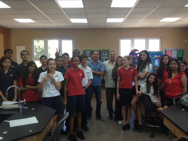 Caption: Tadzio Bervoets of the Nature Foundation with Learning Unlimited Principle Robert Gibson, Learning Unlimited Science Coordinator and Teacher Mrs. Notani and the Grade Nine Biology Class