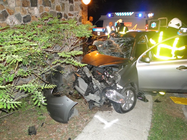 On the scene the driver of the car with license plate 4559 AAB whose condition seemed to be extremely serious was removed from the vehicle, treated on the scene by paramedics and then transported to the Sint Maarten Medical Center for further treatment. The Fire Department that were also on the scene immediately went into action by using the metal cutting machine (The "Jaws of Life") to remove part of the mangled wreck to remove the passenger. After being removed from the wreck the passenger was also treated on the scene by paramedics and then transported to the Sint Maarten Medical Center for medical treatment. The investigation done by the Police Traffic Department and statements from witnesses indicate thus far that driving at high speed and losing control of the vehicle was the cause of this accident. The victims with initials D.R.P. and S.Q.V. are both French nationals visiting the island. Later in the early morning hours the traffic Department learnt from the medical center that the driver of the car died as a result of the injuries he sustained. The passenger was also flown to Martinique for further medical treatment because of his serious condition.