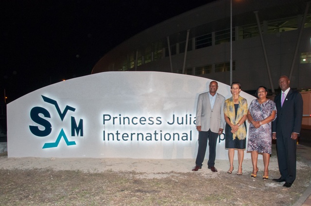 Photo Caption: The new SXM brand logo and signage unveiled at the entrance area of Princess Juliana International Airport (SXM), on February 2, 2013, at 9:04 PM. L-R: Hon. Romeo Pantophlet, Minister of Transport, Economic Affairs and Telecommunications; Hon. Sarah Wescott-Williams, Prime Minister of St. Maarten; Ms. Regina LaBega, Managing Director of the SXM Airport operating company (PJIAE); Mr. Clarence Derby, Chairman of the Supervisory Board of Directors, PJIAE. (SXM Airport photo)